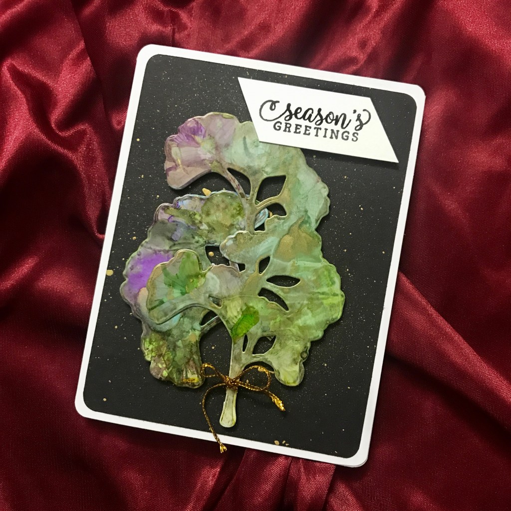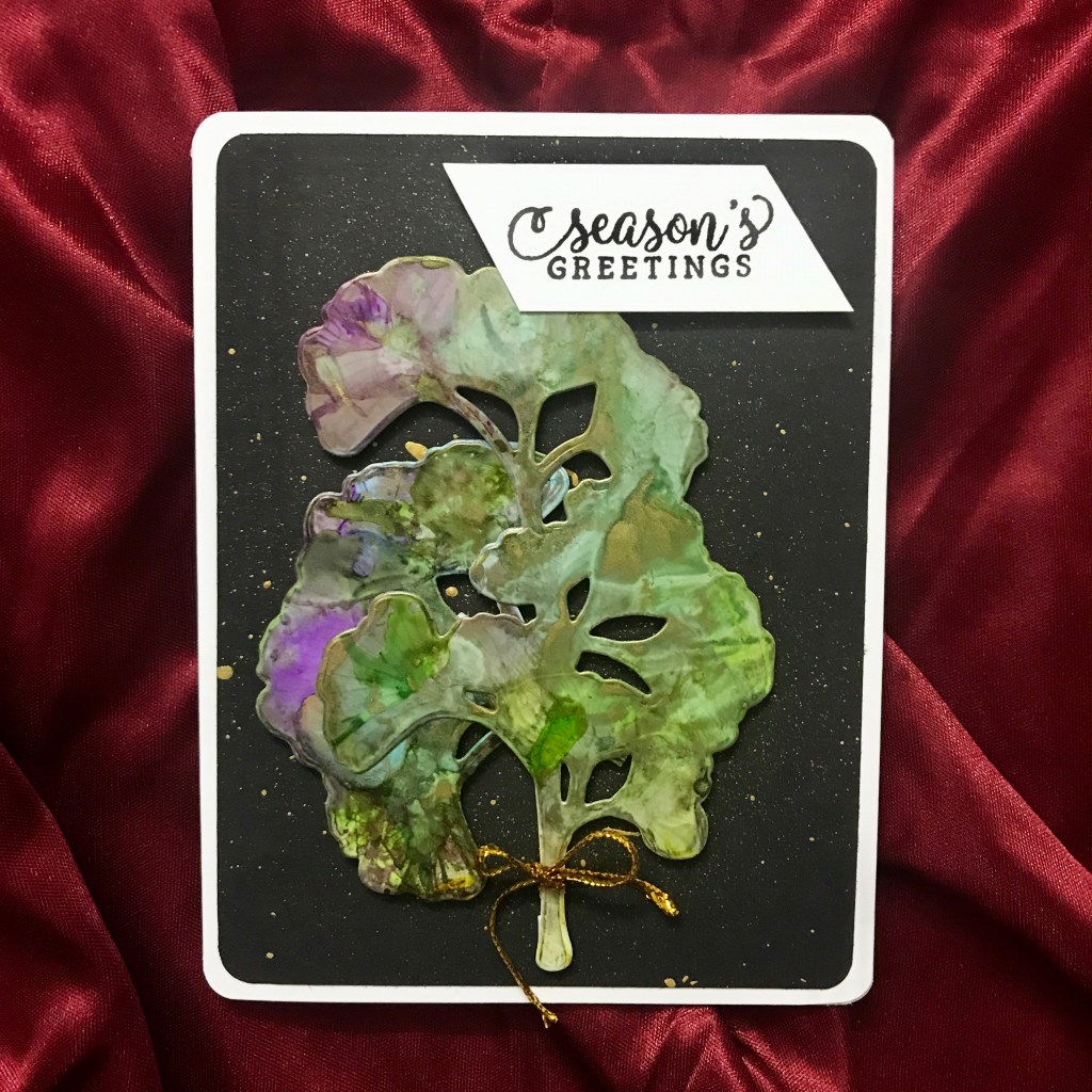 For today’s card I decided just to go with the die. So I directly die cut the images from the alocohol inked Yupo sheets. I sprinkled Gold Acrylic paint on to a piece of Black card stock. Then I arranged these die cut images on the Black card stock using foam squares. Then I adhered the black card stock on to White 4.25 X 5.50 ” note card. I stamped the sentiment “Season’s Greetings” on a piece of Neenah Solar white 110 lbs card stock using Versafine Onyx Black ink. The sentiment is from a stamp set that I bought from Michaels. To add some more fun, I adhered a small Gold thread bow on to the stalk. Tadaa… the card is ready..