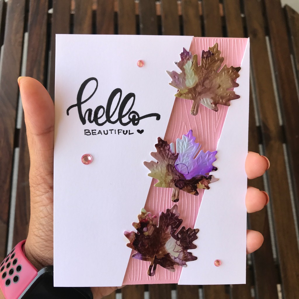 I made an angular CAS card using Alcohol Ink die cuts. I die cut some maple leaves from alcohol ink backgrounds that I had created a while ago. I also dry embossed the maple leaves.