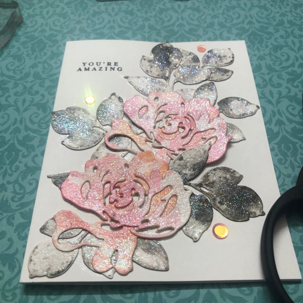 I arranged the die cuts onto a card base (A2 size). I stamped the sentiment “You’re amazing “ from Simon Says Stamp Leafy frames stamp set in Black using Versafine Onyx Black. Finished the card with some sequins.